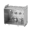 3" H x 3-3/4" W x 2-1/2" D, 25 cu. in. capacity, non-gangable two gang device box. Includes prong tabs to hold at prepositioned depth and clamps for armoured or nonmetallic sheathed cable.