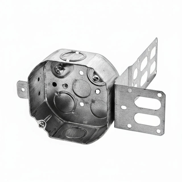 4" octagonal box, 1-1/2" deep with 15 cu. in. capacity. Features concentric knockouts, wraparound bracket for 2-1/2" and 3-5/8" steel studs, integral support bracket, and a raised ground screw.