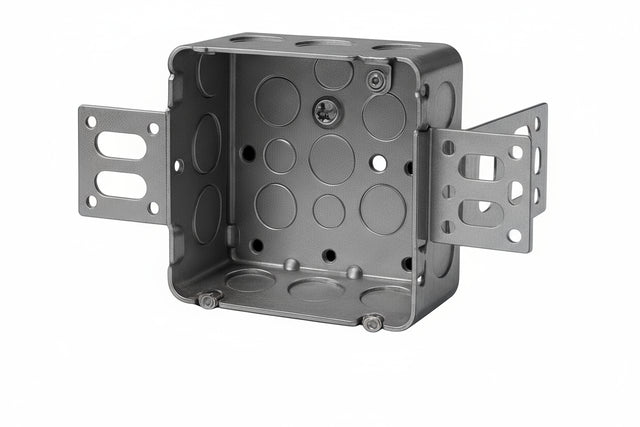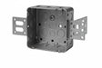 4-11/16" square box, 2-1/8" deep with 42 cu. in. capacity. Includes concentric knockouts, wraparound brackets for 2-1/2" and 3-5/8" steel studs, and a raised ground screw.